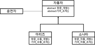 위와 같은 경우는 자동차라는 마티즈와 소나타의 위에 인터페이스, 혹은 상위 클래스를 두어 두 객체의 공통행동을 추상화하고 운전자는 추상화된 인터페이스, 혹은 클래스를 활용하여 다른 부분의 변화를 몰라도 된다.